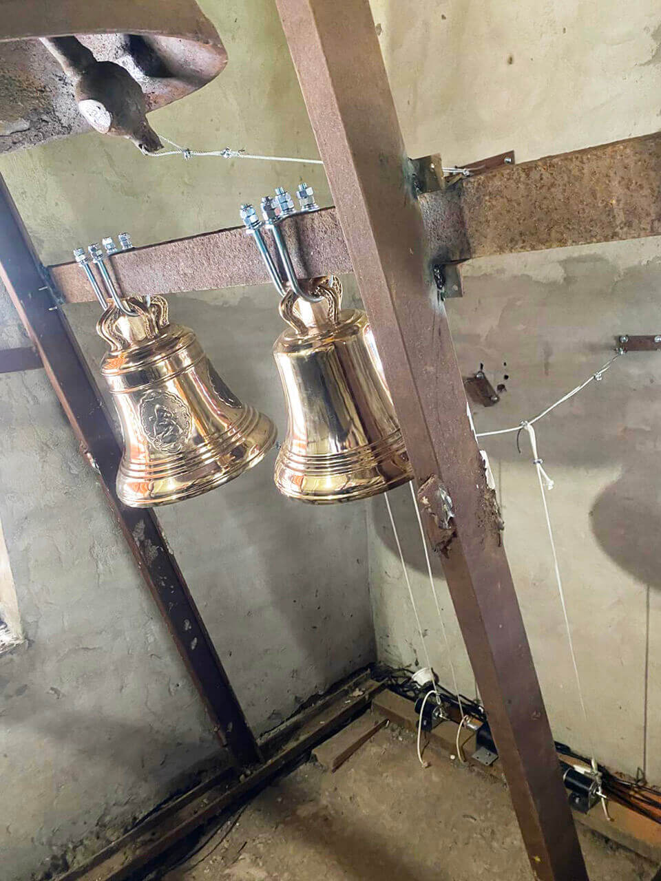 Храмы Агапита Печерского и Первомученика Степана с. Минай Закарпатской обл., 5 бронзовых колоколов от 8 до 200 кг. Кстати, подобрать 2 новых колокола к 3 большим существующим помогли мы: